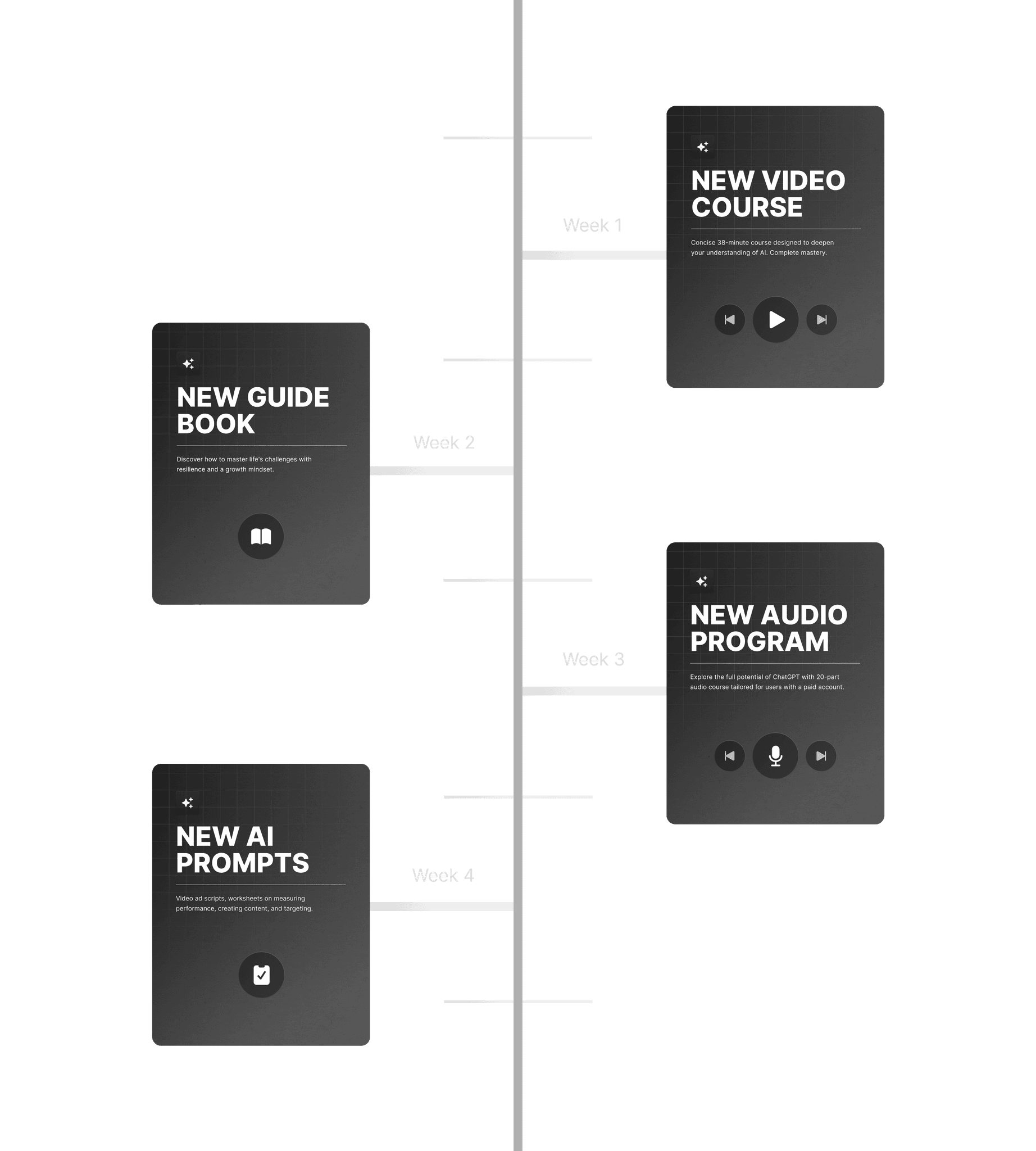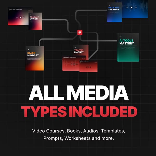 Ebooks, Videos, Audios, Templates, Prompts, Guides, Articles, Workbooks, Mini-Courses, Notion, and more.